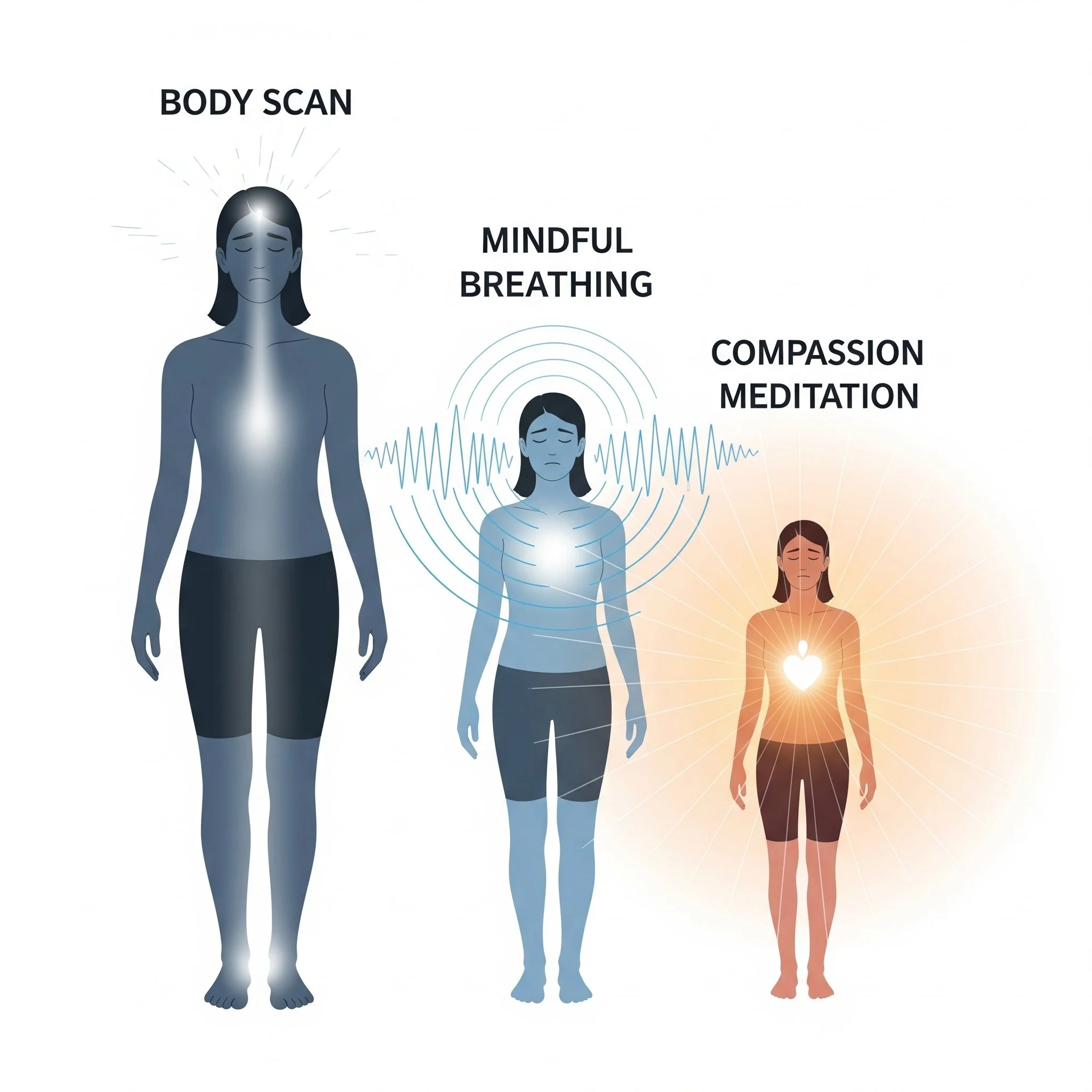Simple practices like body scans, mindful breathing, and compassion meditations can help ground you when you're emotionally fatigued. For emotional tiredness, it can also be helpful to name what you're feeling without needing to fix it immediately—just noticing, "I'm tired and that’s okay.